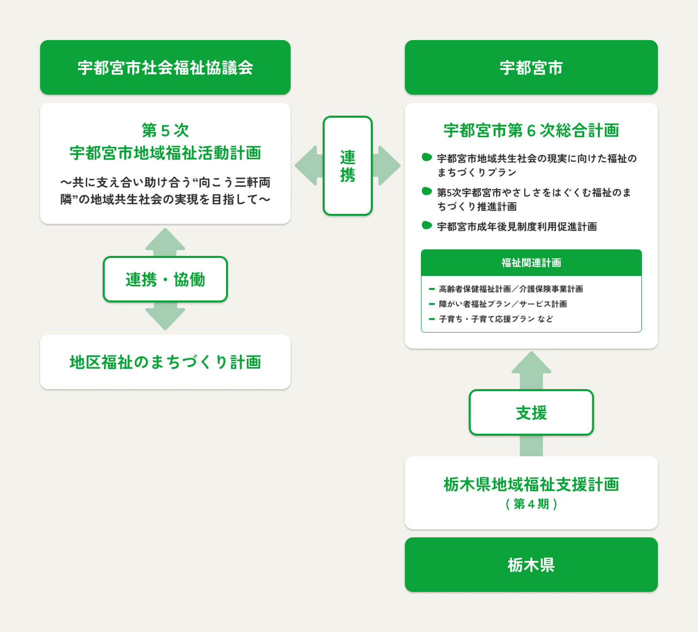 宇都宮市社会福祉協議会では、地区社協や宇都宮市、ボランティア団体等の参画を得て、「宇都宮市地域福祉活動計画」を5年ごとに策定しています。 この計画は、宇都宮市で策定する「宇都宮市地域共生社会の実現に向けた福祉のまちづくりプラン」と理念や地域福祉の方向性などについて共有し、一体的に地域福祉活動を進める内容となっています。