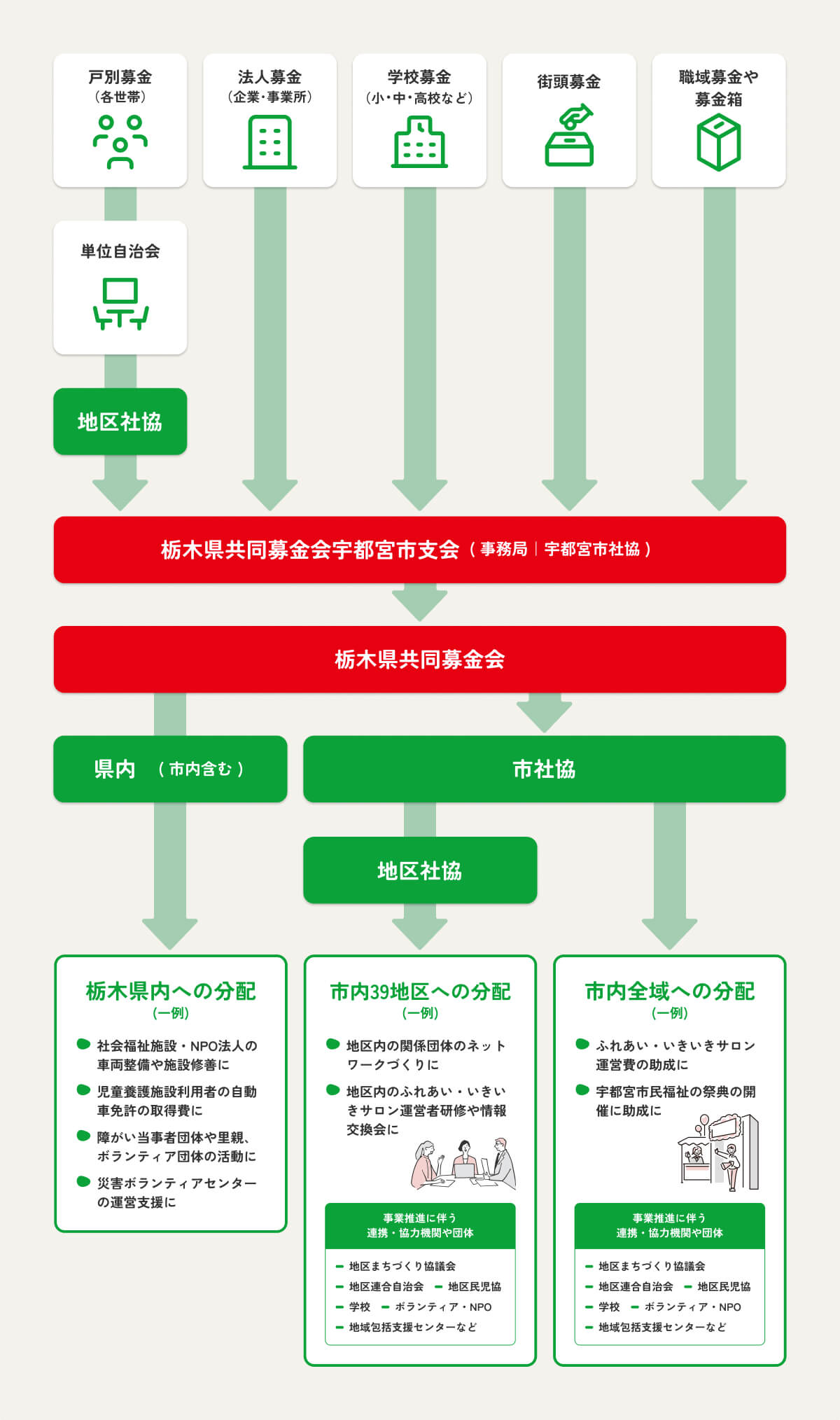 募金は宇都宮市内の自治会や企業、学校等、多くの皆さまにご協力いただいています。ご協力いただいた募金は、全額、栃木県共同募金会に納入され、配分計画に基づき、栃木県内と宇都宮市内に配分され、様々な地域福祉活動に活用されます。