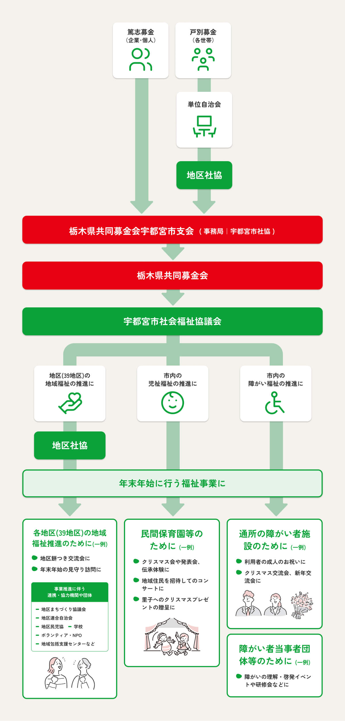 募金は宇都宮市内の自治会や企業・個人等、多くの皆さまにご協力いただいています。ご協力いただいた募金は、「宇都宮市内」の社会福祉施設・団体や民間保育園、地域の年末年始事業に行う交流事業に活用されるほか、地域福祉事業等に活用されます。