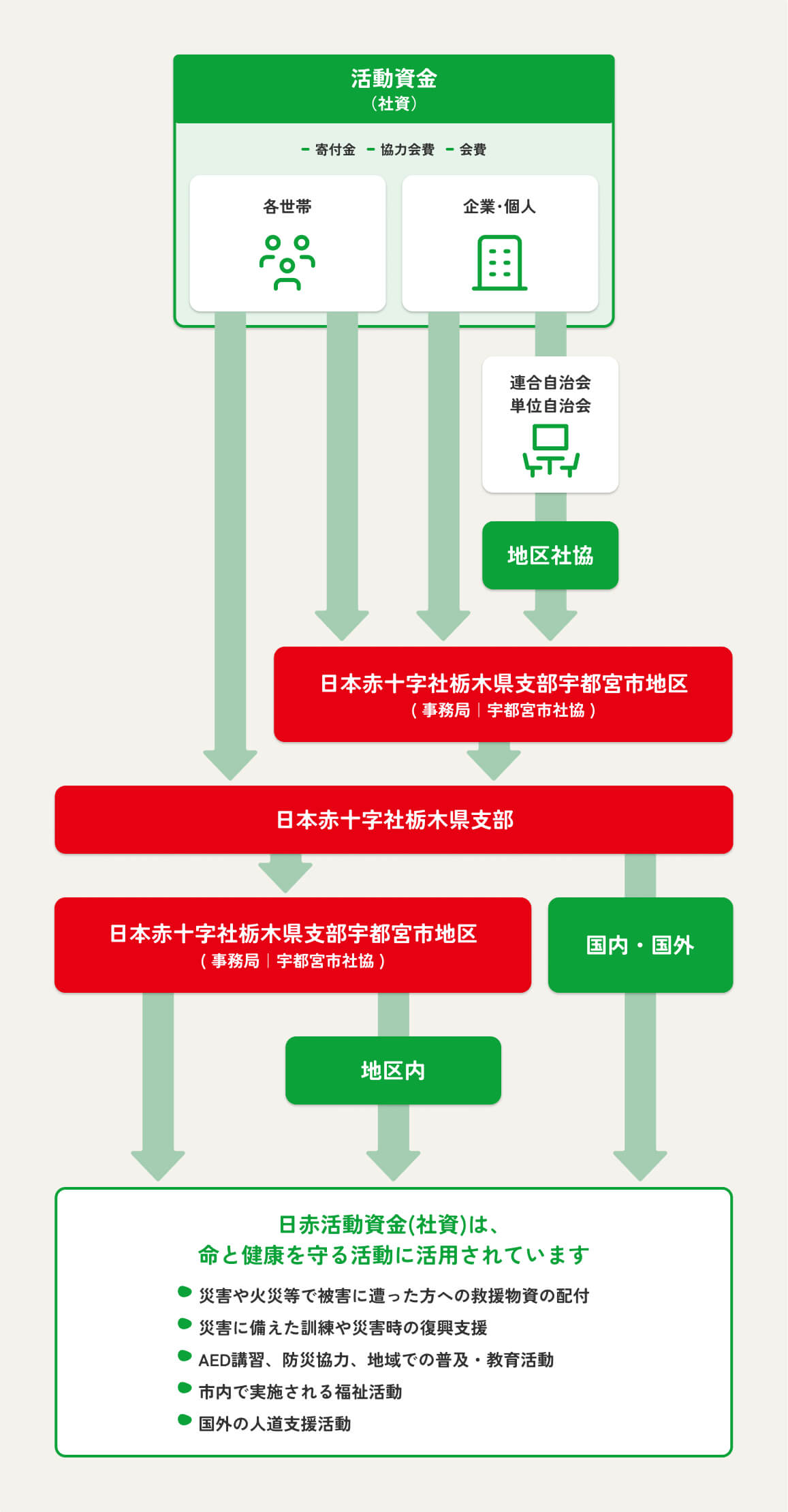 募金は宇都宮市内の自治会や企業・個人等、多くの皆さまにご協力いただいています。 ご協力いただいた募金は日赤栃木県支部に納入され、命と健康を守る活動に活用されます。