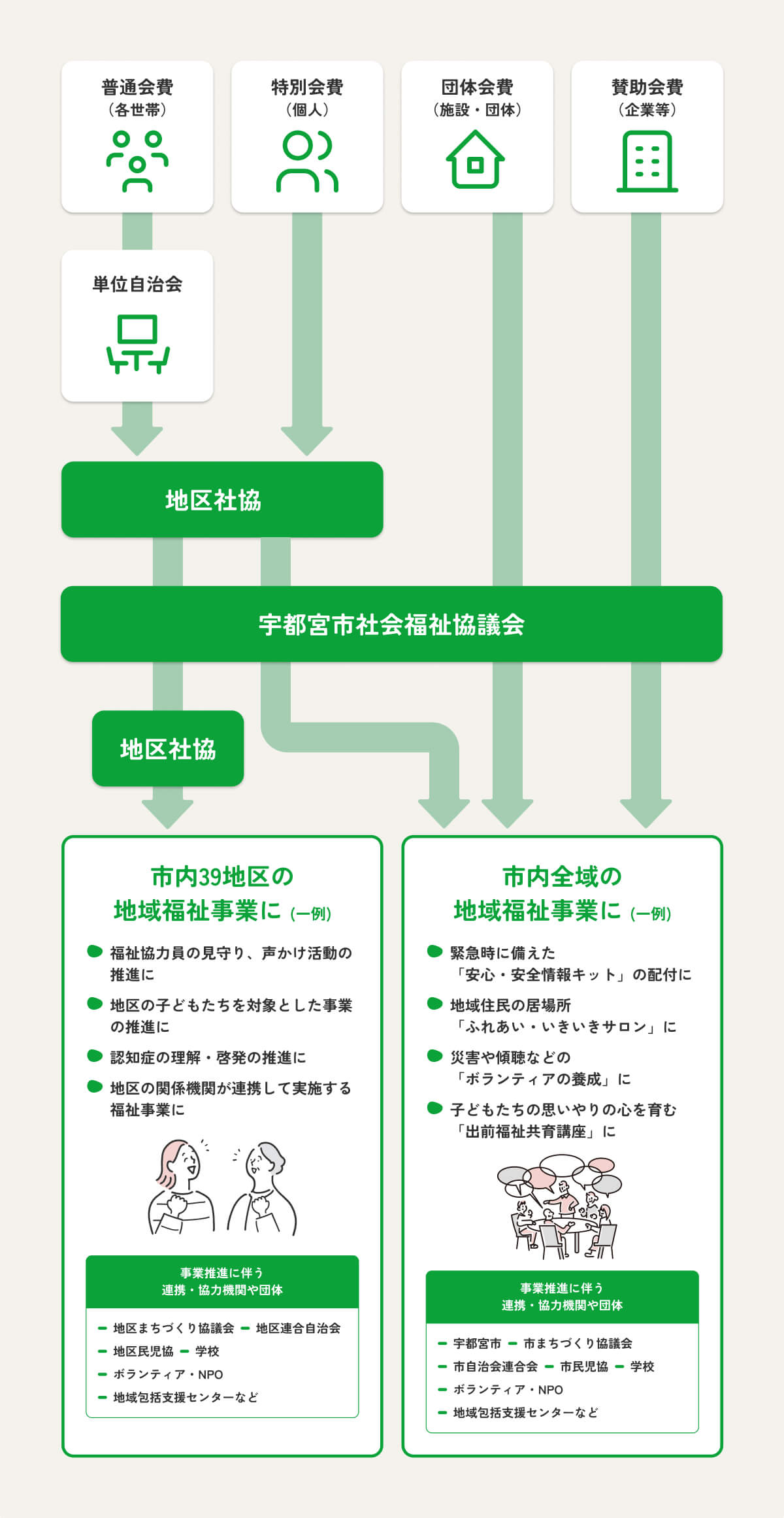 会員会費は、住民の皆さまの身近な生活や福祉の問題を解決し、安心して暮らせる地域を目指し、宇都宮市内の各地区(39地区)で行われている地域福祉活動や、市内全域を対象に実施している地域福祉活動の財源となっています。