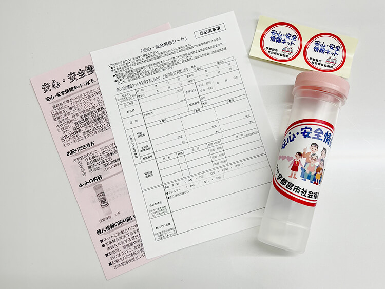 緊急連絡先などを書いた情報シートが入ったプラスチック製の筒を冷蔵庫で保管し、緊急時の迅速な対応と連絡に繋げます。